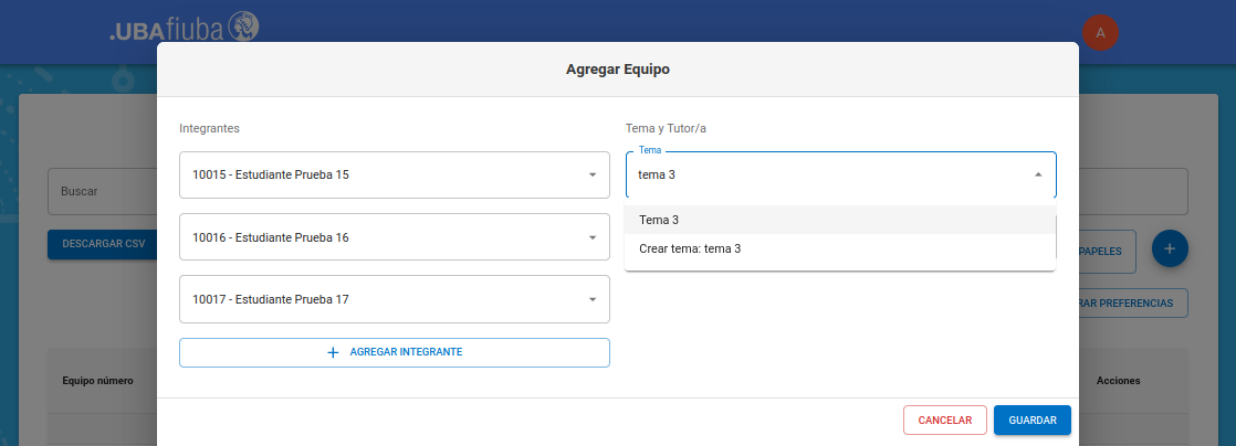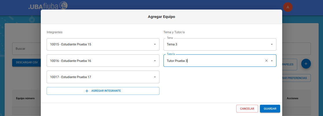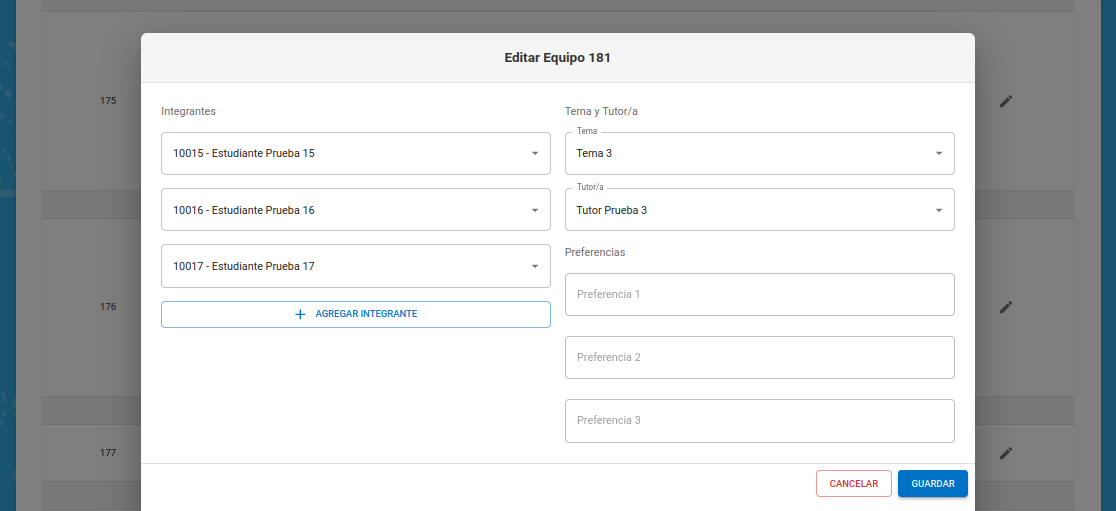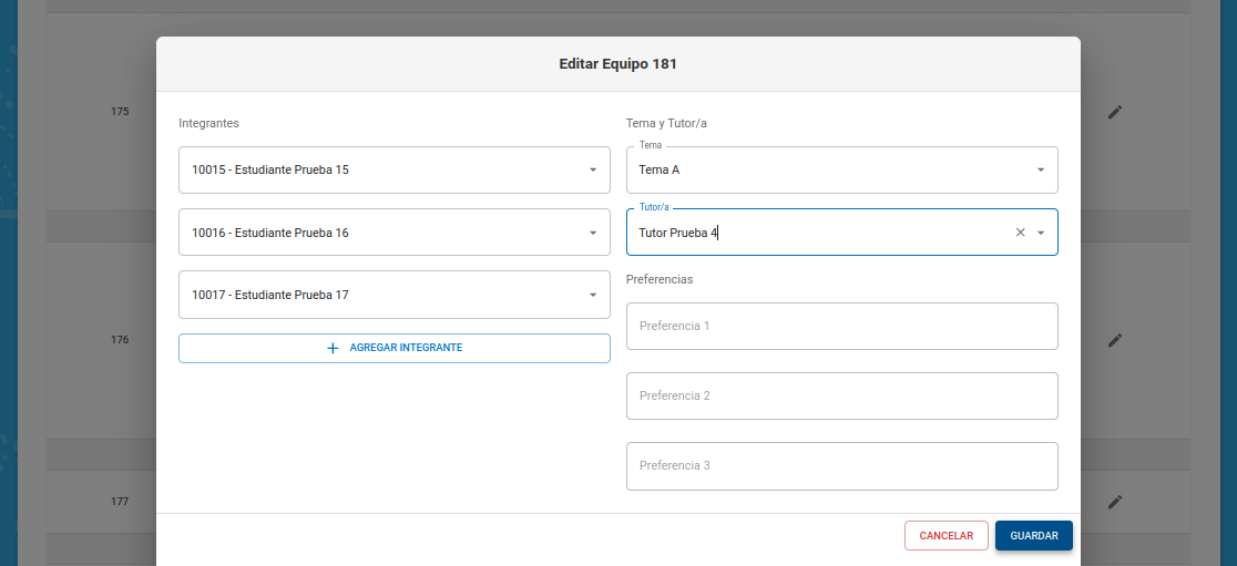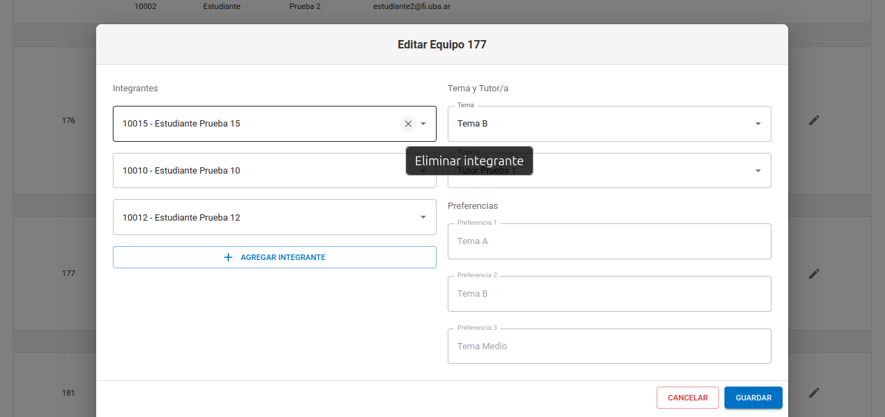 Si elimina todos los integrantes del equipo y confirma la operación, todos sus estudiantes se desasignarán del equipo (luego se podrán agregar a otros equipos si se lo desea) y el equipo vacío se eliminará.