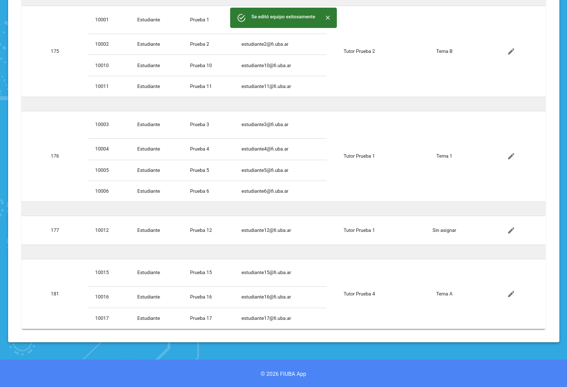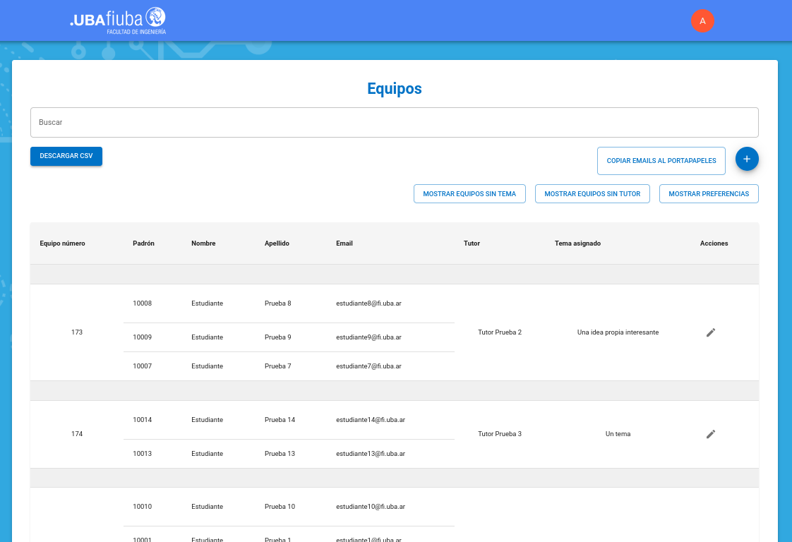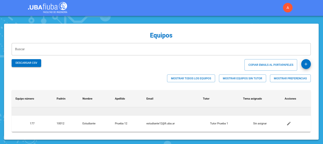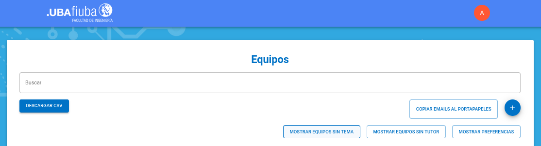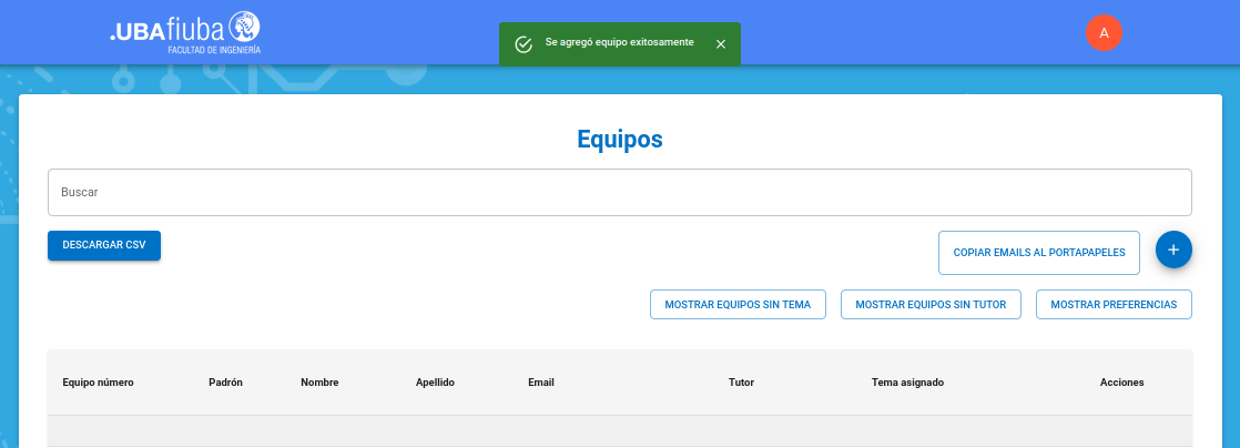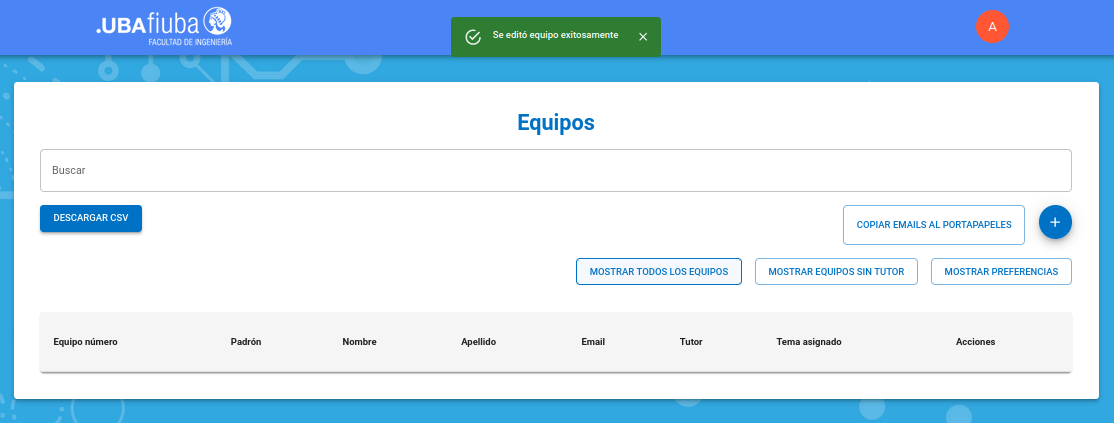 Como ya no existen equipos sin tema, la lista figura vacía, puede hacer click en "Mostrar todos los equipos" para verificar el estado final de los mismos.