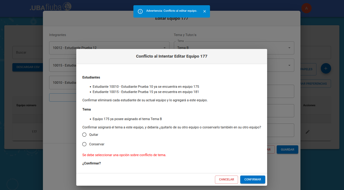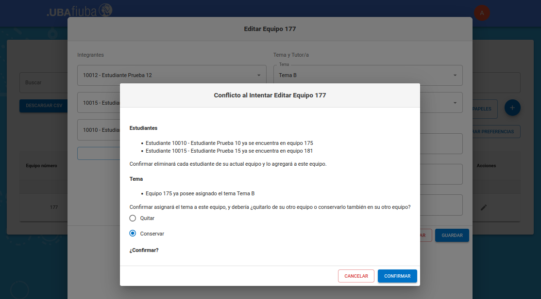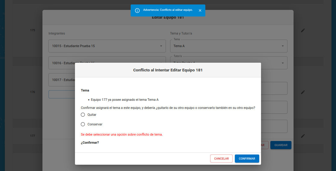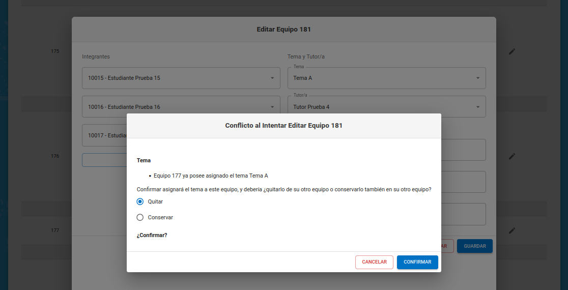 En este ejemplo de edición encontramos conflicto de tema y elegimos quitarlo del equipo que lo tenía anteriormente.
