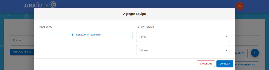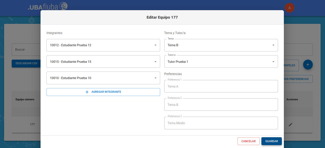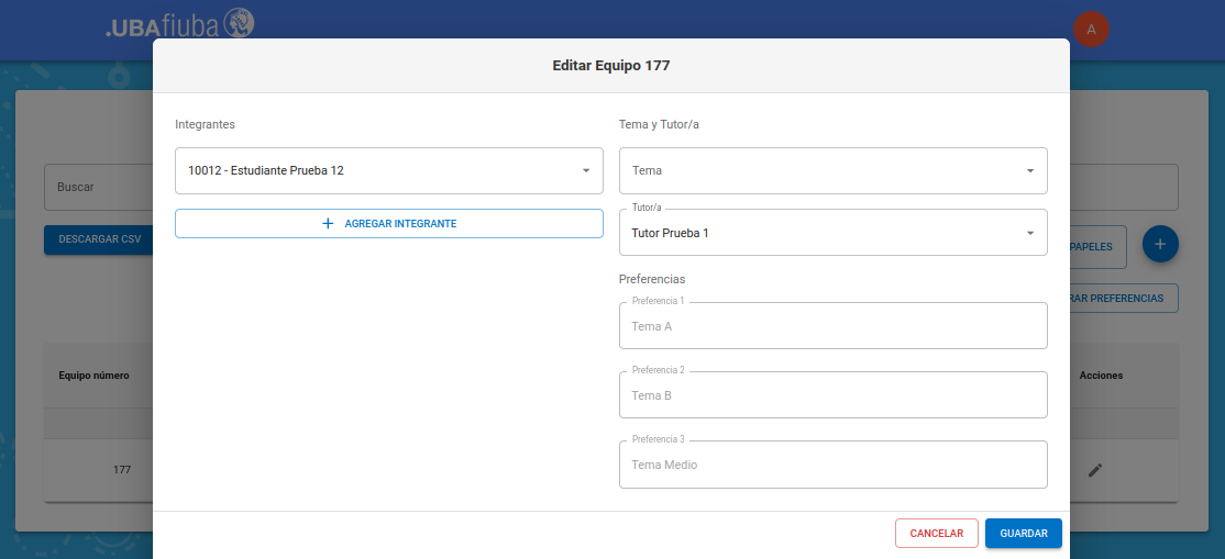 En este ejemplo, modificaremos tema y tutor de este equipo.