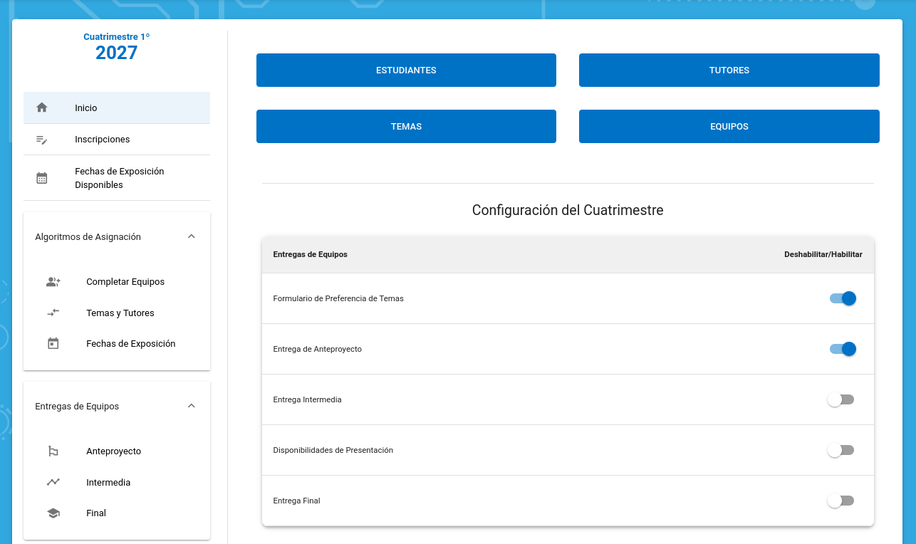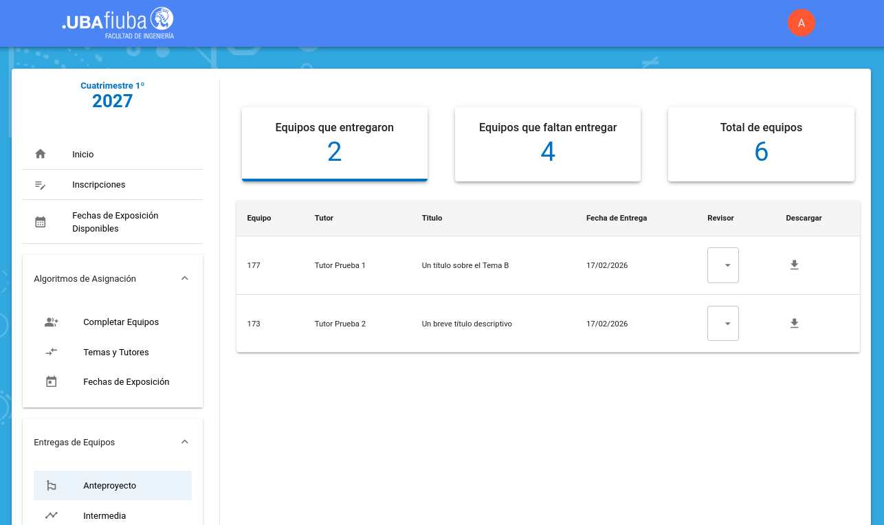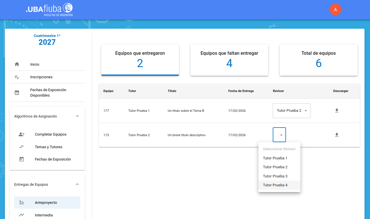 Adicionalmente, en la pantalla de entregas de anteproyecto, podrá seleccionar al revisor de cada uno utilizando un drop-down. Si su revisor deseado no está en la lista desplegable de tutores, debe agregarlo al cuatrimestre manualmente, desde la pantalla de "Tutores".