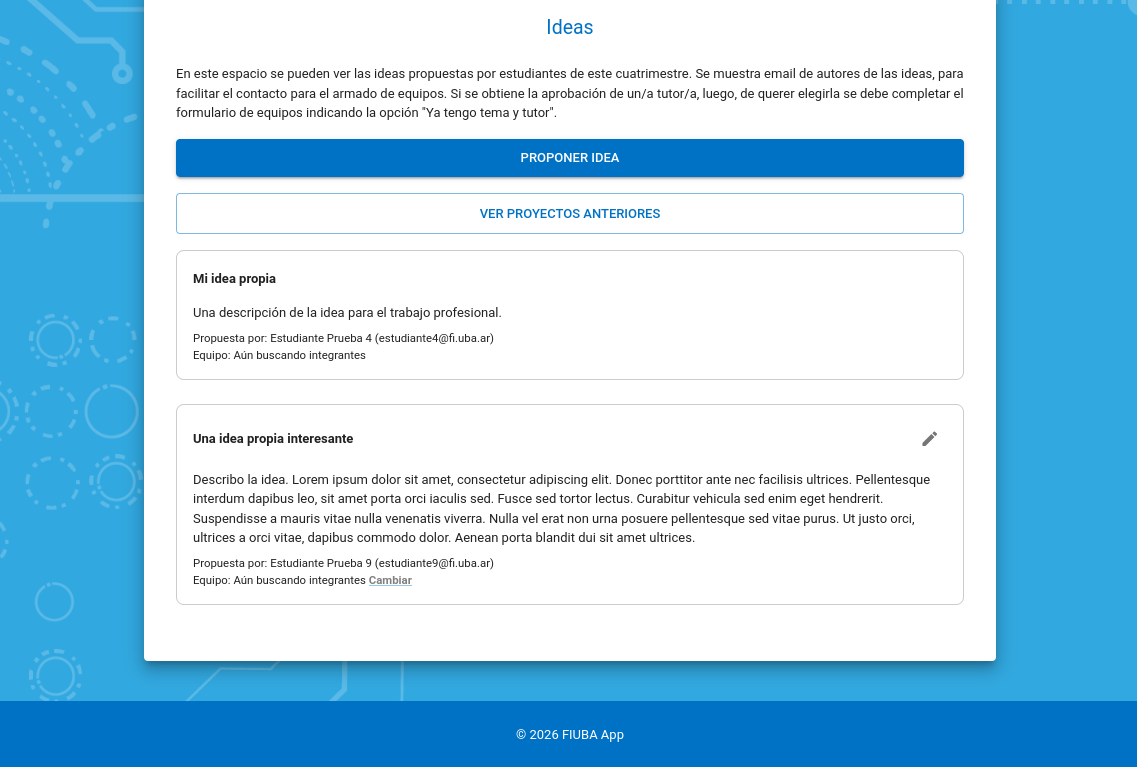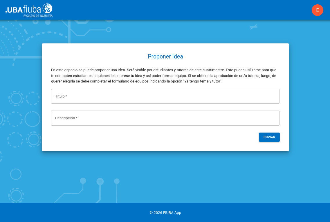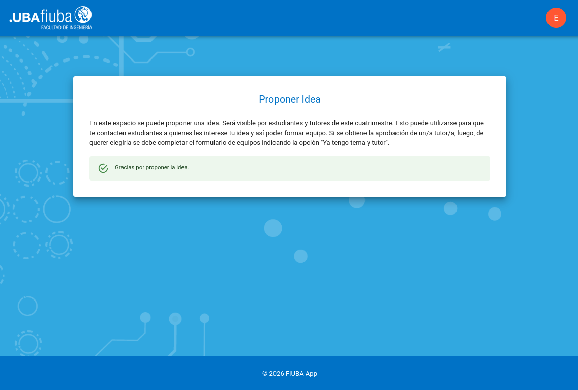 Importante: actualmente tutores del cuatrimestre pueden ver las ideas propuestas por este medio, pero no pueden interactuar (aprobarlas / desaprobarlas / sugerir modificaciones). El acuerdo con tutores sigue siendo manual y externo al sistema. Puede ver información de contacto de tutores desde la sección "Contancto de tutores" en la página de inicio si lo desea.