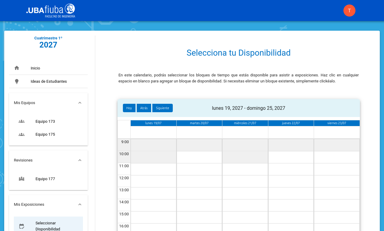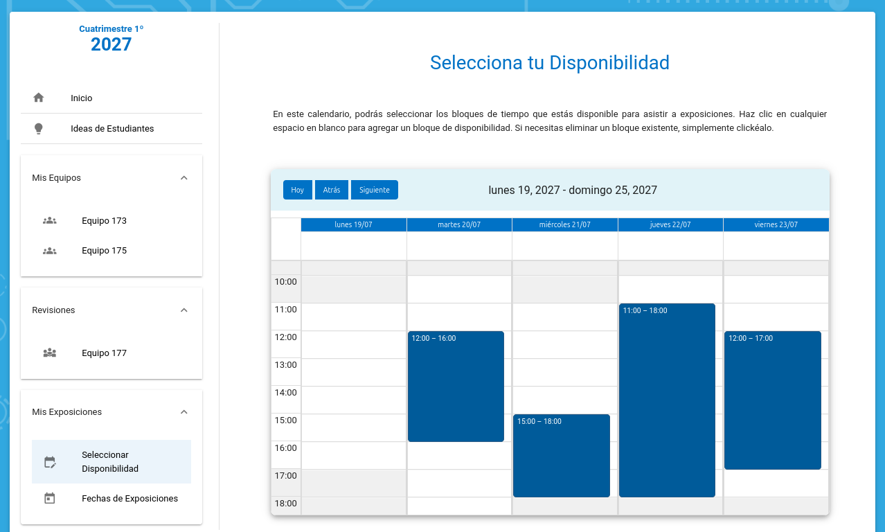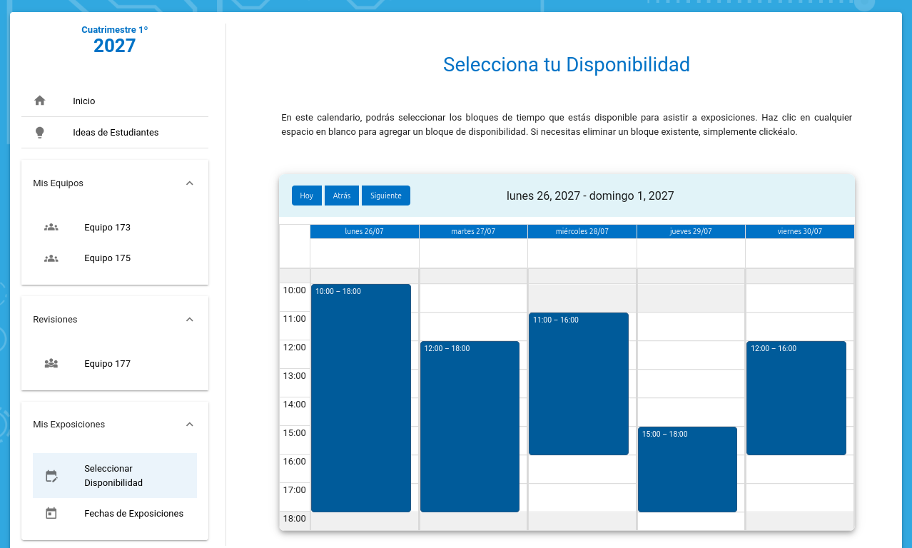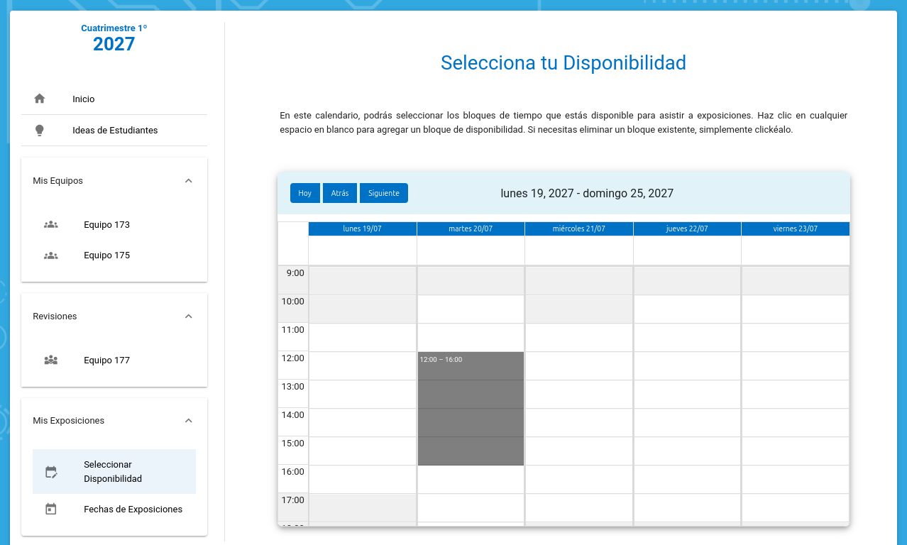 4. Podrá ver un calendario interactivo, donde los horarios marcados como disponibles para exposiciones se muestran en blanco y los no disponibles en gris.