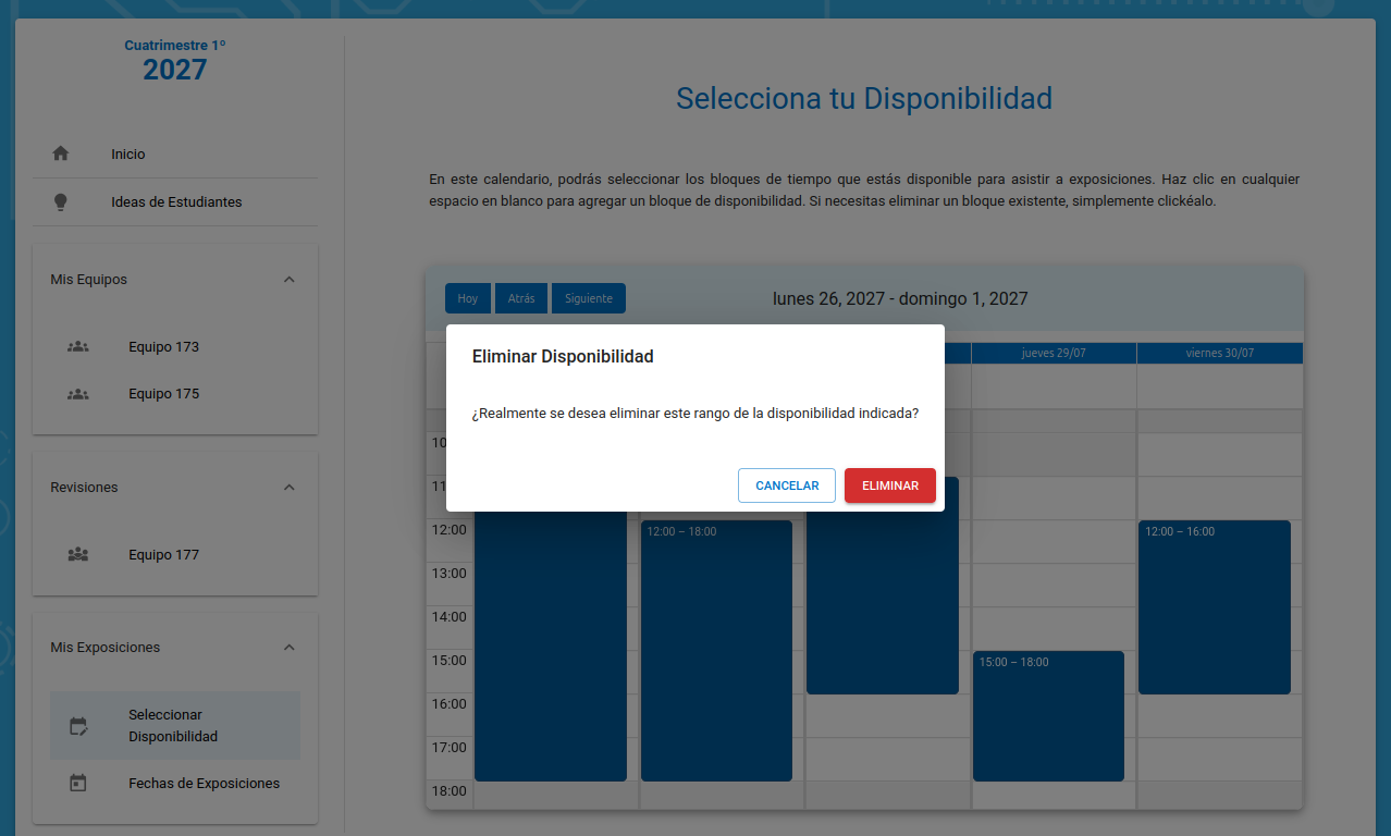 10. De confirmar por error o ya no estar disponible en un determinado rango de un día, puede eliminar dicho rango de su disponibilidad clickeándolo. Aparecerá una ventana de confirmación en la que clickear Eliminar.