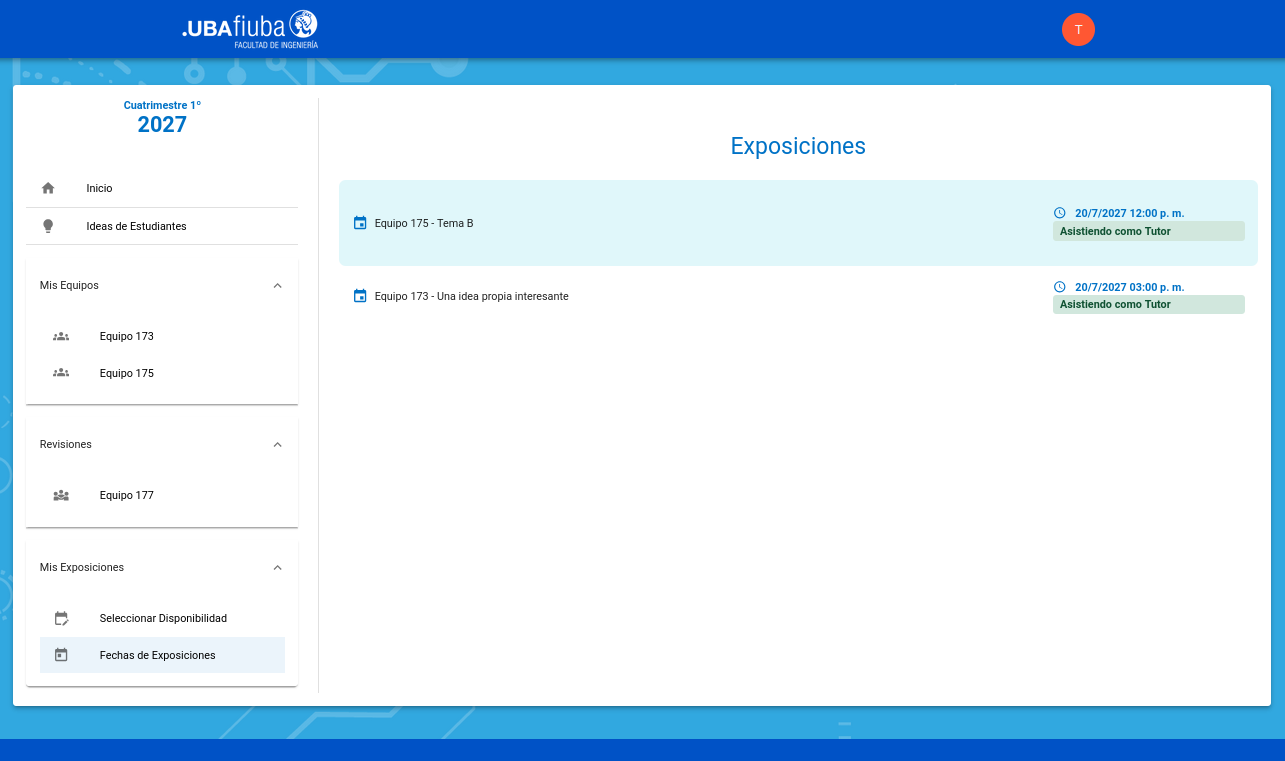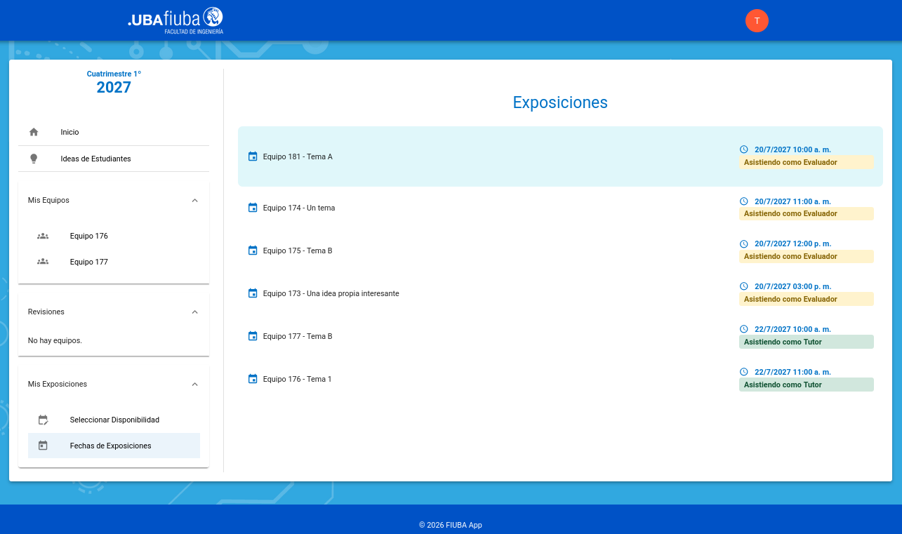 En este ejemplo se puede observar cómo se muestra en pantalla que un tutor actúa en rol de tutor en exposiciones de algunos equipos y de evaluador en exposiciones de otros.
